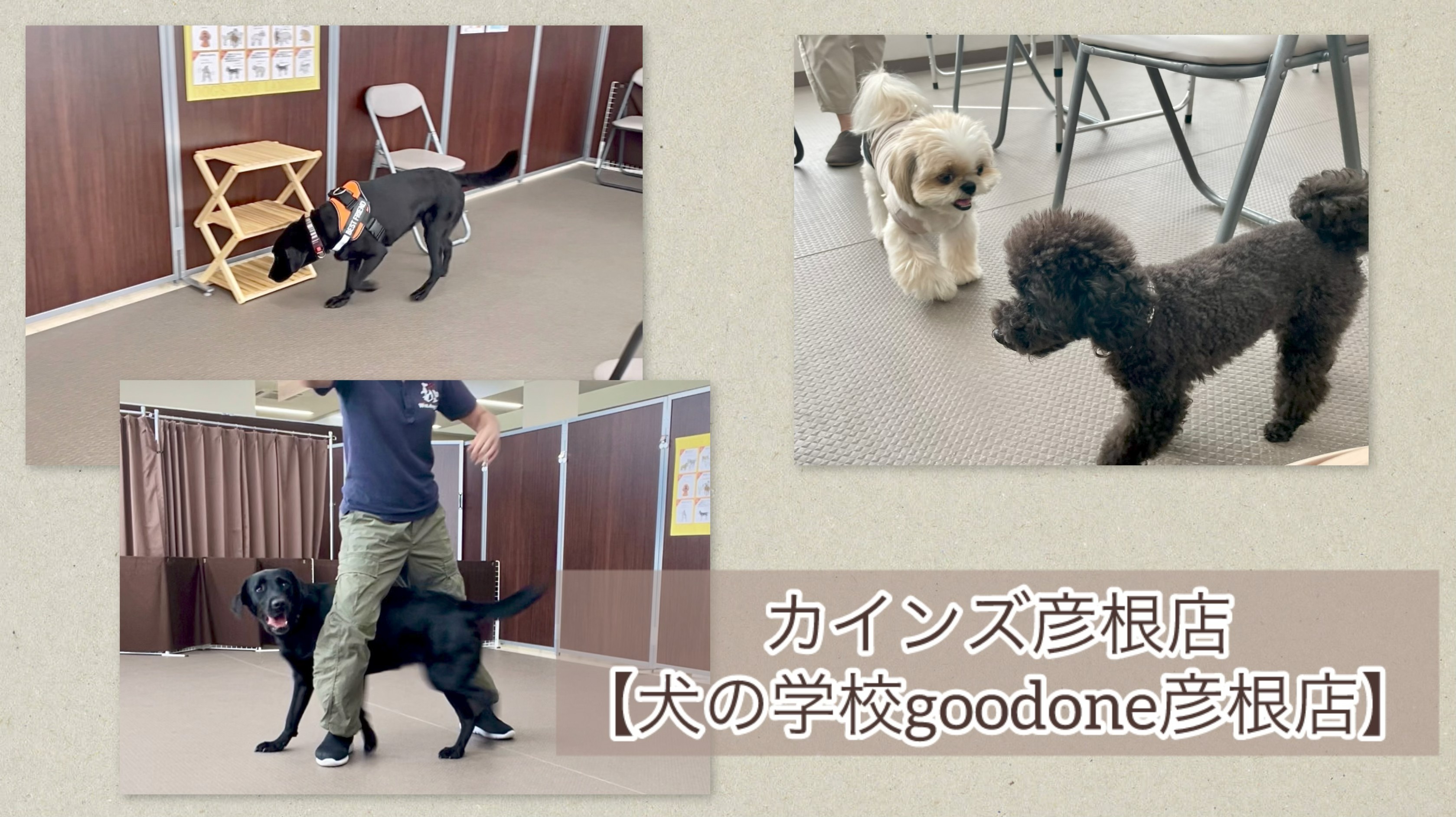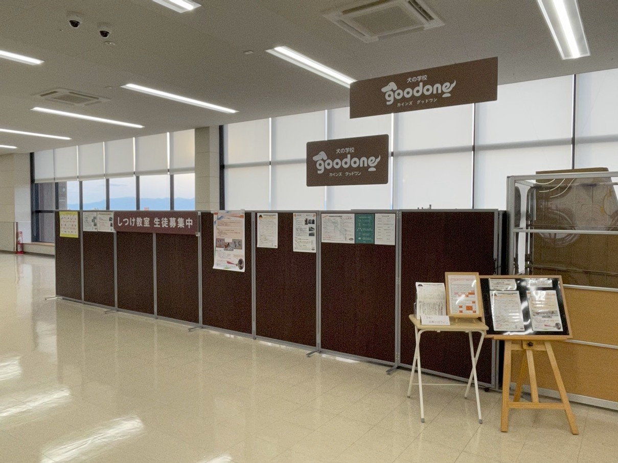カインズ彦根店〒522-0069 滋賀県彦根市馬場2丁目1-1しつけ教室は2階エレベーターホールにございます。2階駐車場、店舗出入口2ヶ所、どちらからでも教室は見える位置にあります。電車等でお越しの方はエスカレーター、エレベーターをご利用いただき2階までお越しください。※駐車場は無料でご利用いただけます ※ペットカートのご用意あり(数量限定/各サイズご用意あり) ※JR東日本琵琶湖線 彦根駅西口より徒歩約30分、彦根循環線 湖国バス 彦根駅前~カインズモール 約15分 ※愛犬と一緒に店舗内お買い物が可能です ※カインズ会員限定 ドッグラン利用可能 ※教室前にベンチがありますのでレッスン前の待機場所としてご利用ください教室の様子