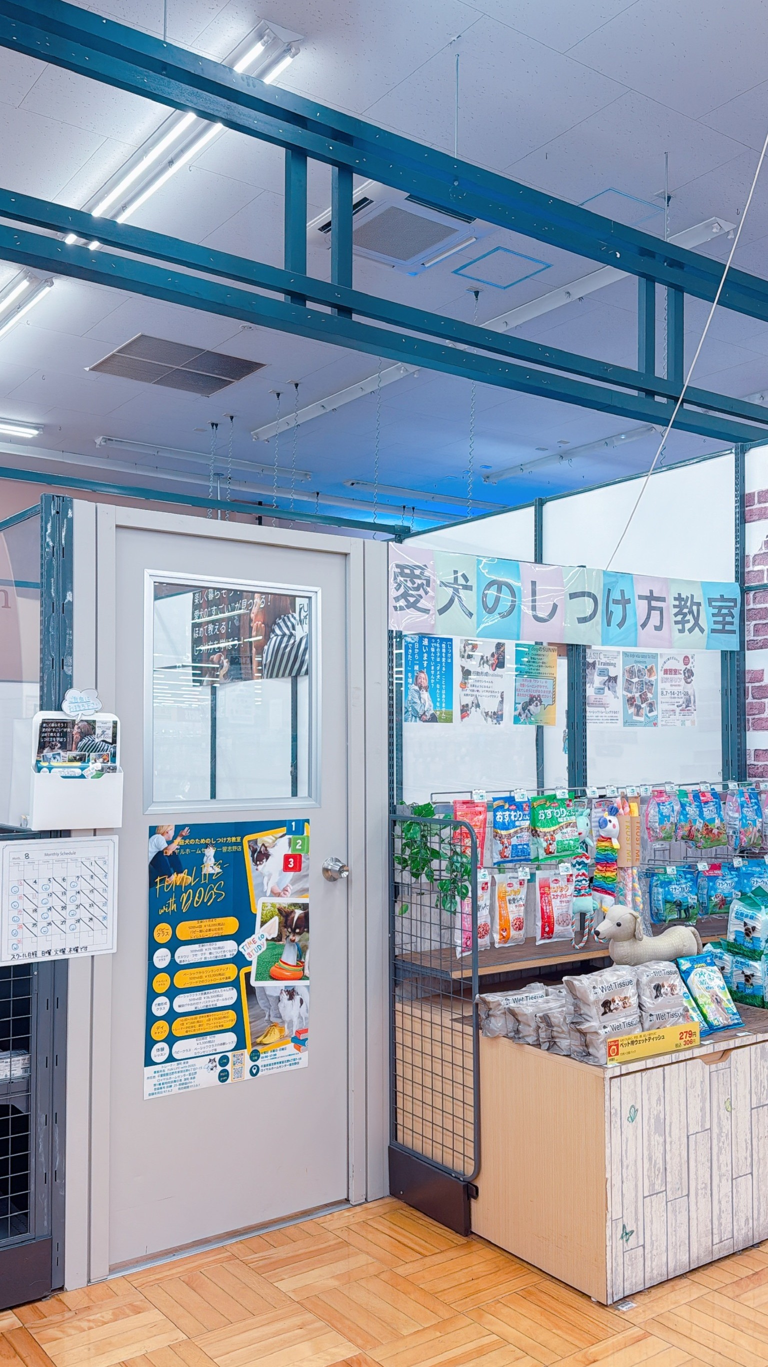 ロイヤルホームセンター習志野店〒275-0001 千葉県習志野市東習志野6-7-15しつけ教室は1階、アニマルシティ・観賞魚売り場横にございます。※駐車場は無料でご利用いただけます ※ペットカートのご用意あり(数量限定/各サイズご用意あり) ※①京成本線:八千代台駅 西口からバス 京成バス<2番のりば>[津21]津田沼駅ゆき「整備工場」下車徒歩約1分 ②JR総武線:津田沼駅 北口からバス 京成バス<4番のりば>[津01]習志野出張所ゆき「習志野五丁目」下車徒歩約6分 ※愛犬と一緒に店舗内お買い物が可能です教室の様子
